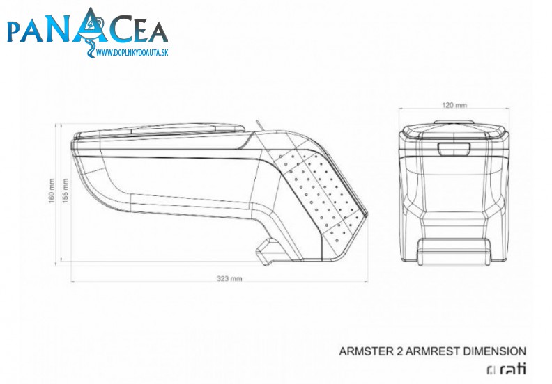 Kvalitná lakťová opierka moderného dizajnu ARMSTER je vyrobená v kombinácií plastu a pohodlnej eko-kože na vrchu v čiernom alebo v sivom prevedení. Vnútorná mechanika je vyrobená z kvalitného kovového materiálu. Opierka slúži k pohodlnému položeniu pravej ruky pri jazde a ako úložný priestor v automobile. Lakťová opierka prispieva ku komfortu jazdy a v neposlednom rade dotvára a dopĺňa interiér vozidla. Opierka je plne nastaviteľná a je dodávaná s presnými montážnymi adaptérmi na montáž pre zvolený typ auta. Lakťovú opierku je možné nastaviť v požadovanej výške, vrchná časť je posuvná. Uhol vyklopenia a samozrejme veľký, praktický úložný priestor vo vnútri opierky sa starajú o komfort počas jazdy nielen pre vodiča, ale aj pre spolujazdca. Opierka disponuje s vyberateľnými koženým puzdrom. Montáž opierky nie je náročná pomocou redukcií a samoreziek – špecifické uchytenie pre každý model automobilu.